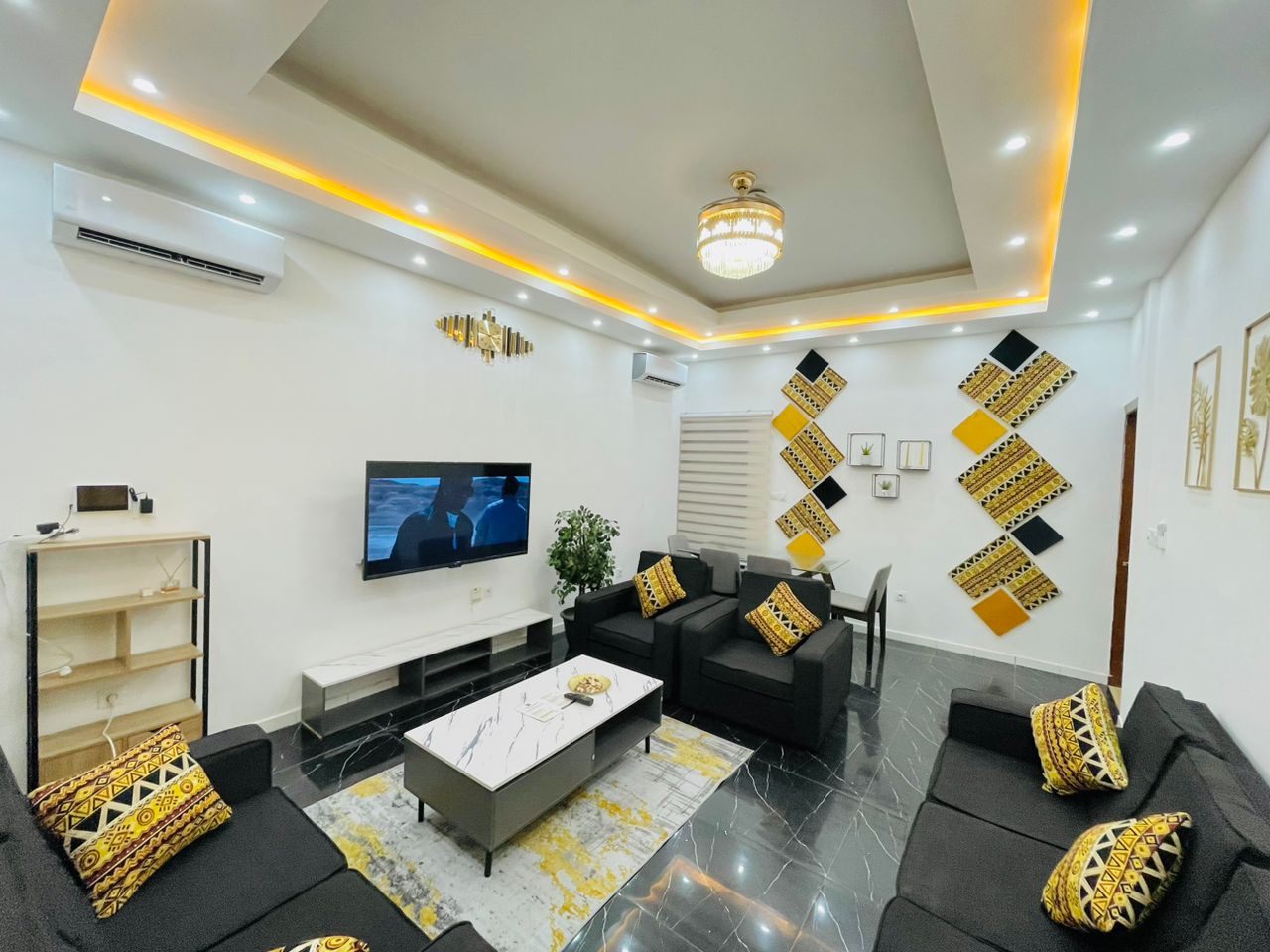À LOUER (Pour vos séjours à Lomé) _Produit direct 1_ Belle Villa meublée dublex staffé de 03 chambres, dont chaque chambre avec sa salle de douche, 02 Salons, + 01 dépendance avec sa douche. Chauffe eau, clim, brasseurs, caméra de surveillance, interphone-videophone, Wi-Fi, Netflix, allumage des lampes automatique, système d'alarme, chauffe eau solaire... 02 toilette visiteur disponible Garage motorisé pour 02 Voitures Espace aéré pour les fêtes et pleins de choses... *Lieu* Agoé réserve, non loin de l'école internationale Mariam. *Prix* 750.000f mensuel. *Caution* 100.000f à déposer, remboursable à la fin de séjour après état des lieux *Visite* programmée et facturée 5000f. *Frais de prestation* 25% du montant de séjour pour courte durée, 1 mois de loyer pour long séjour. _Produit direct 1_ *Donnez tout juste votre date de réservation*